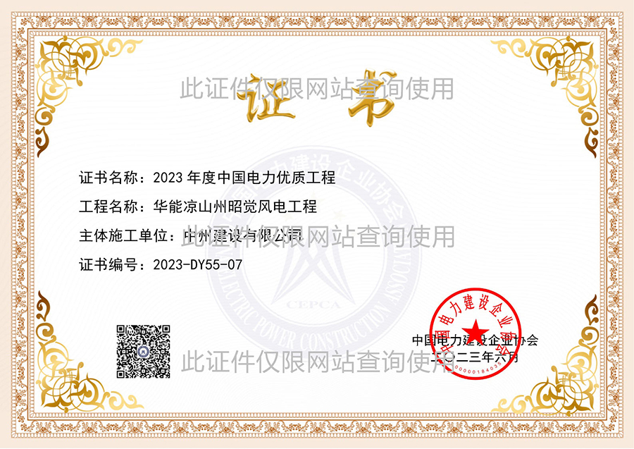 國優(yōu)證書:華能涼山州昭覺風電工程
