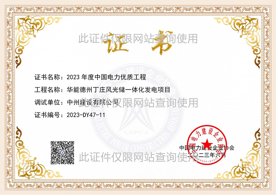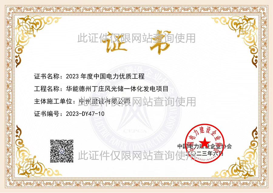 國優(yōu)證書:華能德州丁莊水庫200MW光伏發(fā)電項目主體施工單位